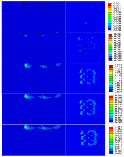 The front soil is actively damaged by gravity anchors and is greatly deformed. The soil area behind the anchor is passive. The posterior soil is not affected by the gravity anchor. However, it can be seen from the figure that there are some deformations. This is due to the fact that the soil area at the rear end of the anchor flows as the anchor moves, and its settling and deformation is caused by its gravity. During the motion of the gravity anchor, soil deformation is concentrated around the gravity anchor. The deformation of the soil close to the gravity anchor is larger than the deformation of the soil away from the gravity anchor. The closer the soil is to the anchor, the greater the deformation. It can be seen from the Figure 14 that the plastic deformation of the soil first occurs in two small areas around the anchor. At this time, the plastic deformation is relatively small. This is caused by the gravity of the gravity anchor. As the motion process progresses, the soil around the shear key at the rear of the anchor first appears plastically deformed. So, the failure of the soil starts from the rear shear key. The soil in front of the anchor immediately undergoes plastic deformation and failure. Along with the motion of the anchor, the front shear key gradually begins to destroy the soil. Additionally, the damage extends to the soil surface. As a result, the destruction of soil is a gradual process. The plastic deformation of the soil is mainly concentrated near the shear key and around the anchor. Gravity anchors locally damage the soil during motion and then reach the ultimate bearing capacity. So, the failure mechanism of the soil is a local failure. In summary, the failure mechanism of soil mass is a local progressive failure.
