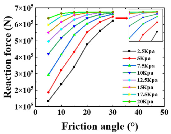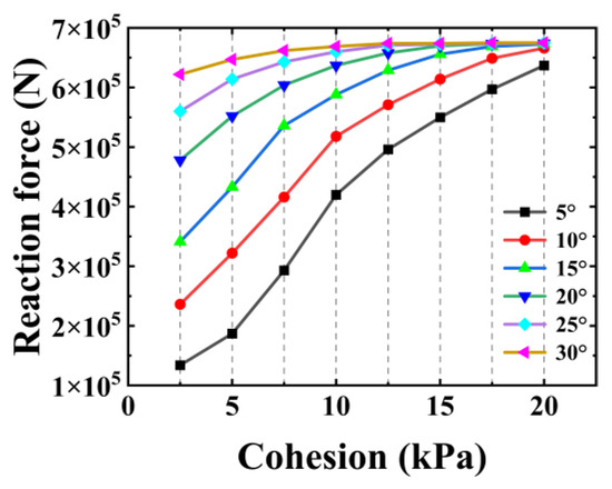 The cohesion was changed to obtain the bearing capacity curve, as shown in Figure 16. As the cohesion increases, the bearing capacity also shows an increasing trend. Additionally, with the increase in cohesion, the change in the bearing capacity curve gradually becomes gentle. It can be seen from the figure that the initial value of each bearing capacity curve increases with the increase in the friction angle. When the friction angle gradually increases to a certain value, the bearing capacity tends to remain at a certain fixed range. Therefore, as the cohesion increases, the bearing capacity curve tends to be flat. The increase in the friction angle has less and less influence on the bearing capacity.