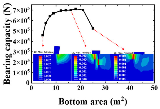 From Figure 18, it can be found that there is an optimal bottom area for the gravity anchor. When the area is less than the optimal area, the bearing capacity increases from 459,186 N to 710,181 N. The increase ratio is 54.7%. When the bottom area is larger than the optimal area, the bearing capacity is reduced from 710,181 N to 522,911 N. The reduction ratio is 26.4%. The soil true strain maps of gravity anchors, as shown in Figure 18, with bottom areas of 4 m2, 9 m2, and 16 m2 are extracted to study the reasons for the change in bearing capacity. It is obvious that the soil mass with the optimal bottom area has the largest true strain. Additionally, the deformation area of the soil is the largest. The depth of the impact of gravity anchors on the soil is also the largest. For gravity anchors whose bottom area is less than the optimal area, the soil strain is the largest below the front edge of the anchor bottom. Therefore, the failure of the bearing capacity is mainly caused by the local failure of the soil at the front of the anchor bottom. The maximum soil strain of the gravity anchor with the bottom area larger than the optimum area appears on the surface of the subsoil. The failure of the bearing capacity is mainly caused by the damage to the surface soil at the bottom of the anchor. However, the maximum soil strain of the gravity anchor with the optimal area appears in the deep layer of the soil. The failure of the bearing capacity is mainly caused by the overall failure of the anchor bottom soil. Therefore, when the anchor bottom area is less than the optimal area, the soil failure is a local failure. When the anchor bottom area is larger than the optimal area, the soil failure is the sliding failure of the shallow layer. When the anchor bottom area is the optimal area, the soil failure is a deep failure. Therefore, the bearing capacity of the gravity anchor with the optimal area is the largest.