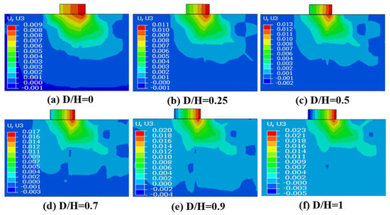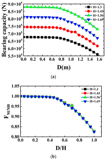 The location of the gravity anchor mooring point is closely related to the bearing capacity of the gravity anchor. The bearing capacity of the same gravity anchor at different mooring heights is obtained by using gravity anchor models. The calculation results are shown in Figure 19a. In each group of models, the bearing capacity of the gravity anchor decreases with the increase in mooring point height. The change trends of each group of curves in the figure are similar. The bearing capacity of the first half of the curve decreases slightly, and it can be considered that there is no change in the first half. The bearing capacity of the second half of the curve decreases greatly. In this part, the bearing capacity is greatly affected by the mooring height. It can be clearly found from Figure 20 that when 0 < D/H < 0.5, the vertical displacement of the gravity anchor changes very little. The vertical displacement of the gravity anchor increases by a factor of 2 when D/H is between 0.5 and 1. The gravity anchor has undergone a relatively obvious flip in this interval. Stability and carrying capacity are greatly reduced. When the height of the mooring point of the gravity anchor is less than 0.5 H, the gravity anchor only translates and does not rotate under the action of tension. However, when the height of the mooring point exceeds 0.5 H, the gravity anchor will rotate. The bearing capacity of the gravity anchor will gradually decrease. The higher the height of the mooring point, the greater the rotation amplitude and the smaller the carrying capacity.
