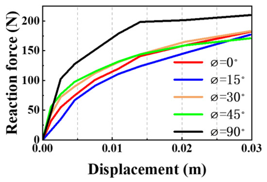 The gravity anchor model test rig mentioned in Section 2 has a height-adjustable pulley. The force angle of the anchor can be changed by adjusting the height of the pulley. We adjusted the pulley height to test and obtain the experimental data presented in Figure 21. The figure shows the bearing capacity–displacement curves of the force angles of 0°, 15°, 30°, 45°, and 90°, respectively.
