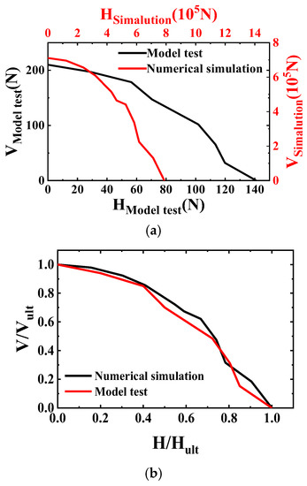 The V-H failure envelope is an effective way to reasonably express the ultimate bearing capacity of shallow buried foundations. The V-H envelope of the model test is plotted in Figure 22a. Hsimalution represents the horizontal bearing capacity results in the numerical simulation. HModel represents the horizontal bearing capacity results in the model test. Vsimalution represents the vertical bearing capacity results in the numerical simulation. VModel represents the vertical bearing capacity results in the model test. The black curve and axis in the figure represent the failure envelope of the model test. The V-H failure envelope of the same gravity anchor is drawn by finite element modeling, as shown in Figure 22a. The red curves and axes in the figure represent the numerically simulated failure envelopes. The V-H failure envelopes of numerical simulations and model tests are normalized. The results are shown in Figure 22b. Hult represents the maximum horizontal load carrying capacity. Additionally, Vult represents the maximum vertical load capacity. From the figure, it can be found that the normalized V-H failure envelopes of the numerical simulation and the model test coincide. So, the results of the numerical simulation can be used for analysis.