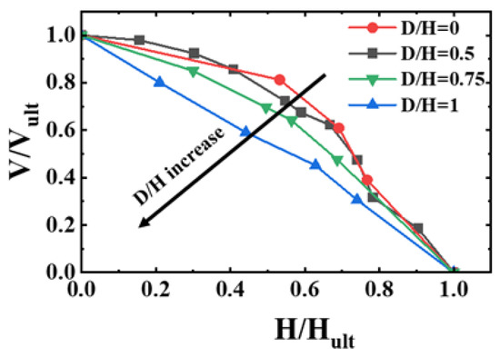 Next, the influence of the gravity anchor mooring point height on the V-H failure envelope is studied. The bearing capacity is obtained by changing the height of the mooring point of the gravity anchor. We plotted the normalized V-H failure envelopes for different D/H (D represents the gravity anchor mooring point height, and H represents the gravity anchor height), as shown in Figure 23. It can be known from the figure that the normalized V-H failure envelopes of gravity anchor foundations with different mooring heights are similar. However, as the mooring height increases, the failure envelope gradually shrinks inward. When the horizontal bearing capacity generated by the inclined load is less than 20% of the ultimate horizontal bearing capacity, the normalized vertical load of the anchor changes little. When the horizontal bearing capacity exceeds 20% of the ultimate horizontal bearing capacity, the normalized vertical load varies greatly.
