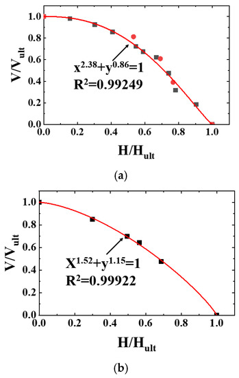 Zdravkovic et al. [28] suggested that the values of a and b should be a = b = 2 when the anchor foundation with a length-to-diameter ratio L/Di = 0.5~1.4 is under an inclined load. Senders and Kay [29] suggested that the values of a and b should be a = b = 3 when the anchor foundation with a length-to-diameter ratio L/Di = 2.8 is under an inclined load. Many scholars have fitted the normalized failure envelope in the V-H stress space with mathematical expressions to study the values of a and b. However, the change in the height of the mooring point was not considered. Based on the content of this section, the fitting curve is obtained by fitting the above normalized V-H failure envelope. The fitting results are shown in Figure 24.