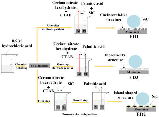 In addition, a two-step electrodeposition process was also adopted to fabricate the electrodeposited surfaces. The electrodeposition process was carried out in two steps of 2 min each. In the first step, only cerium nitrate hexahydrate (Ce(NO3)3·6H2O), hexadecyl trimethyl ammonium bromide (CH3(CH2)15NBr(CH3)3) and SiC particles with the same concentration as above were added in the mixed solution. Then, palmitic acid was added to the mixed solution for the second step of electrodeposition. The prepared specimens were marked as ED2. Furthermore, according to the preparation process of the ED1 sample, the electrodeposited surfaces without SiC particles were also prepared for comparison and were marked as ED3. Figure 1 shows the schematic of the fluorine-free electrodeposition process on the aluminum plate.
