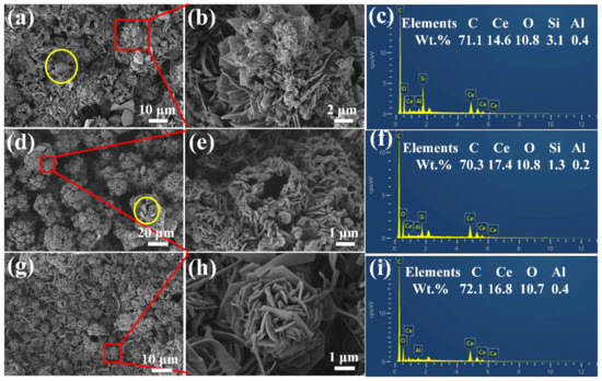 As for the surface of the ED3 sample, micro-scale fibrous-like structures were formed on the surface, and some of the fibrous-like structures formed a chrysanthemum-like structure, as shown in Figure 2g,h. In addition, the EDS results (as shown in Figure 2i and Figure S5) illustrated that the main components of the coating were C, O and Ce. The content of the Al element was very small, indicating that the electrodeposited coating covered the aluminum substrate uniformly.