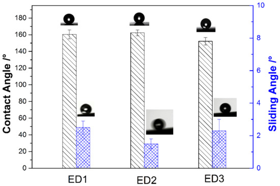 The results of CAs and SAs of the electrodeposited coatings are revealed in Figure 3. It can be seen that the three electrodeposited coatings all reached a superhydrophobic state with static contact angles of 160.3°, 162.3° and 152.2°, respectively, and sliding angles of 2.5°, 1.5° and 2.3°, respectively. The ED2 sample exhibited better superhydrophobic properties. The superhydrophobicity of electrodeposited coatings may be attributed to the micro–nano structure of the surface and cerium palmitate which has low surface energy [19]. Moreover, the variations of contact angles and sliding angles also indicated that the coating prepared by the two-step electrodeposition process had an outstanding surface wettability. According to the Cassie–Baxter theory, the proportion of the actual contact area to the total contact area between a droplet and a solid surface can be reduced by adjusting the microstructure of the solid surface [22]. Due to the structure of the islands formed on the ED2 sample surface, as well as the micro-pores and nano-scale strips on the island making the fraction of solid/liquid interface less than that of the other two electrodeposited coatings, a large amount of air can be reserved in the gaps between the islands on the surface, which results in a larger contact angle and a smaller sliding angle.