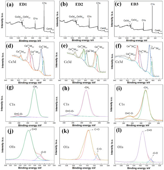 The XPS curves and the associated fine spectrum curves are exhibited in Figure 4. It can be observed from Figure 4a–c that all three electrodeposited superhydrophobic surfaces have strong peaks of Ce, C and O. Among them, C1s, O1s and Ce3d emerged as the typical peaks, and the peak intensities and locations of the three elements are very similar.
