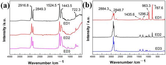 To further analyze the chemical composition of the surfaces, FTIR and Raman spectroscopy results are displayed in Figure 5. It can be seen from Figure 5a that the absorption peaks at 722.3 cm−1, 1443.5 cm−1, 1524.5 cm−1, 2849.3 cm−1 and 2916.6 cm−1 are all observed on the three electrodeposited superhydrophobic surfaces.