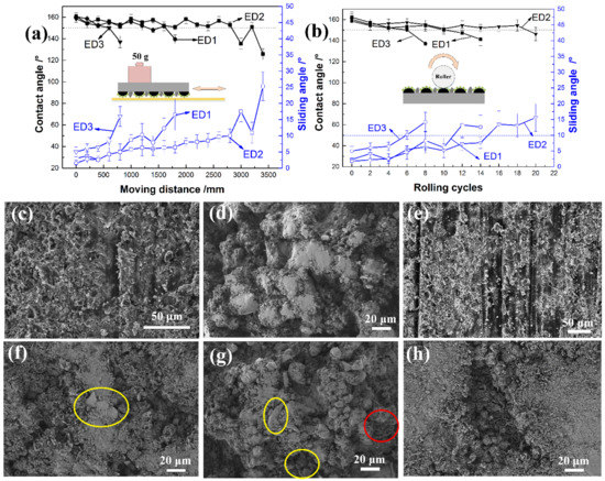 The mechanical durability test of samples: (a) CAs and SAs with moving distance; (b) CAs and SAs with rolling cycles; (c) morphology of ED1 sample after abrasion test; (d) morphology of ED2 sample after abrasion test; (e) morphology of ED3 sample after abrasion test; (f) morphology of ED1 sample after rolling test; (g) morphology of ED2 sample after rolling test; (h) morphology of ED3 sample after rolling test.