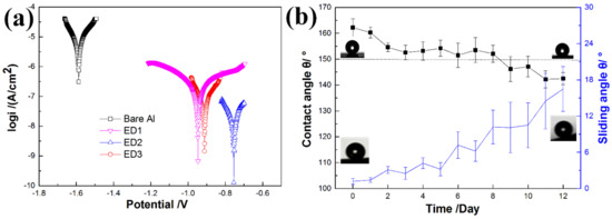 The saltwater immersion experiment results are displayed in Figure 7b. It can be seen that the CAs decreased from 162.5° to 147.5° after 9 days of immersion. The SAs increased from 1.7° to 10.5° after 8 days of immersion. These results also revealed better corrosion resistance of the ED2 sample.