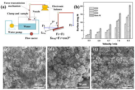 The difference in drag reduction performance may be related to the different surface wettability caused by the special structure on the surface. The aluminum substrate was in direct contact with the spray water, and the contact state was a stable Cassie state. However, for the superhydrophobic surfaces, there would be a discontinuous air film between the spray water and the surface The air film maintained the surface contact state in a Cassie–Baxter state, leading to the water slipping on the surface for better drag reduction. In addition, the mechanical durability of the micro–nano structure on the ED2 sample surface was higher than that on the ED1 and ED3 sample surfaces, which means the micro–nano structure on the ED1 and ED3 sample surfaces may be more easily damaged under the impact of spray water, especially at a high flow rate. This also can be confirmed by the surface morphologies of the samples after the test, as shown in Figure 9c–e. The nano-strip structures on the surfaces of the ED1 and ED3 samples almost disappeared. However, the densely packed convex islands with micro-pores still existed on the surface of the ED2 sample. Therefore, the drag reduction effect of the ED2 sample was greater than that of the ED1 and ED3 samples.