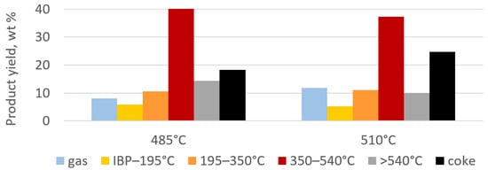 Increasing the temperature to 510 °C, as shown in Figure 2, caused an expected increase in light distillate yield (the yield of fractions > 350 °C decreased by 10.0%), while non-volatile residue yield dropped by a third.