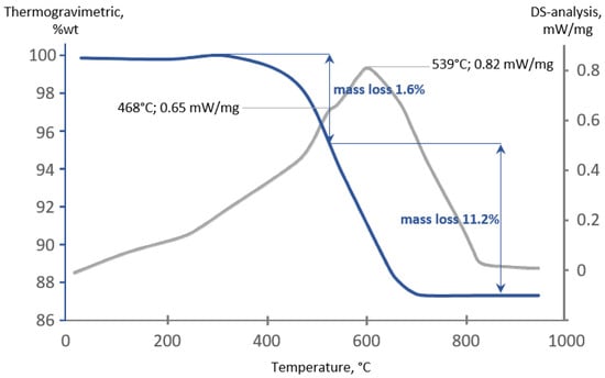 Adsorbent regeneration parameters were evaluated by synchronous thermal analysis (thermogravimetric/differential thermal analysis (TG/DTA)): heat release from coke 1388 J/g spent adsorbent; specific heat release of coke burning 12,437.3 J/g, the temperature of complete regeneration—no more than 749 °C (Figure 3). The temperature is lower than sorbent calcination temperature, so such regeneration does not cause sorbent destruction, and it is not uncommon. For example, FCC regenerators are operated at a similar temperature.