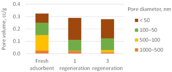 After the first regeneration, the volume of pores with a diameter > 100 nm decreased by about 2 times, and after three regenerations, pores > 100 nm were almost absent. The decrease of macropore volume may be due to their blocking by metals. This assumption is supported by the red tint of the regenerated samples, indicating Fe deposition on the adsorbent surface. However, demetallization of the regenerated adsorbent only slightly decreased (by 3% and 5%, respectively), while remaining above 86%. The decrease of macropores > 100 nm was accompanied by an increase of macropores with a diameter of 50–100 nm, and their volume is sufficient for consistently efficient metal removal. To ensure stable adsorptive removal of metals, sulfur, and non-volatile components from the feed, a portion of fresh adsorbent can be added to the regenerated adsorbent during reactor reloading or to the moving bed after the regenerator.