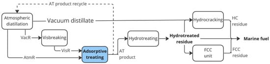 The aim of this study is to investigate adsorptive treatment of atmospheric residue and visbreaking residue as the primary residual feedstocks over novel macroporous adsorbents. The study will assess the impact of diluent use on the efficiency of the process and evaluate the regeneration of the adsorbent. In addition, the study will examine the hydrotreating of the process product to determine its potential for use in the production of low-sulfur marine fuel. The results of the research will allow an evaluation of the potential integration of the adsorptive treatment into the technological scheme of oil refining, with several pathways for low-sulfur marine fuel production.
