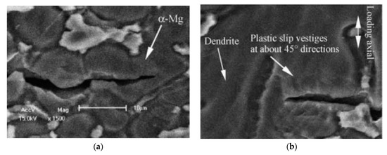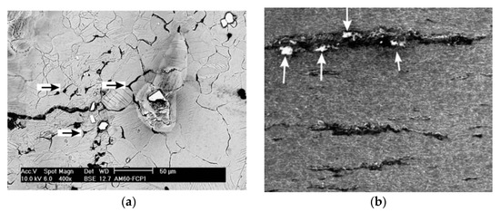 The first discussion about producing any new alloy and material is related to its proper structure and behavior in the face of environmental conditions. In general, improper microstructure and internal defects (microcrack and porosity) greatly reduce the life of the final product depending on the type of loads applied [31]. In summary, the most common methods of improving the quality of microstructure and grain size of AM60 magnesium alloy are thermal treatment [22] and mechanical processes such as the Severe Plastic Deformation (SPD) method [32]. One efficient technique to reduce the weight of automotive mechanical components is the use of AM60 high pressure casting, which is debatable due to internal porosity [33]. The fatigue crack propagation is correlated by the gradual transfer between Intergranular and Transgranular (cleavage) failure mechanisms at the crack tip, which is affected by the plastic zone size and Linear Elastic Fracture Mechanics (LEFM) [34,35]. Figure 1 presents the effect of microstructures on the formation and growth of fatigue cracks through Scanning Electron Microscopy (SEM) observations. In this regard, the presence of oxide inclusions in most metal materials, especially magnesium alloys, can be seen due to the high reactivity of this element, which can reduce the fatigue life of alloy [36].