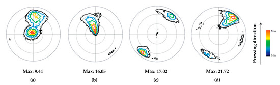The influences of ECAP technique on texture evolution (pole figures) “Reused with permission from Elsevier by License No. 5494610777006” [42]; (a) Extruded; (b) 1 pass; (c) 2 passes; (d) 6 passes.