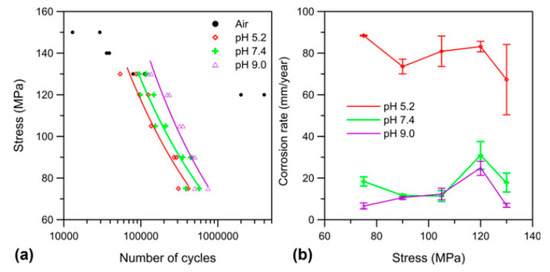 Effect of pH value on the material properties of AM60 magnesium alloy in Phosphate Buffered Saline (PBS) solutions, including (a) HCF region of S-N curve, and (b) corrosion rate [47].