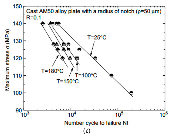 Although the high fatigue strength and low density of AM50 magnesium alloy can be a proper reason to replace aluminum alloys, some shortcomings such as the tendency for corrosion and creep, reduction in fatigue life in the high-cycle state, and low Young’s modulus should not be ignored [50]. Strain amplitude is an influential factor on cyclic stability, hardening, and softening, which its relationship with reversals follow Basquin and Coffin–Manson laws. Moreover, during the Low-Cycle Fatigue (LCF) state, dynamic-strain aging occurs at the total strain amplitude of 1.5 pct, and Transgranular cracks emerge at the surface and then are turned into Transgranular modes [51]. Shrinkage pores are the main sites for the formation of main cracks, in such a way that several cracks form near the shrinkage pores and then propagate, leading to fatigue cracking through the Al-rich eutectic [52]. A serious factor that should be considered about all materials is related to the sensitivity to stress concentration. For example, Marsavina et al. have investigated the effect of stress concentration induced by R-notch and V-notch on fatigue properties of AM50 magnesium alloys [23]. As shown in Figure 5, the fatigue strength has been reduced from 55.85 MPa by 25% and 61.2% for the R-notch and V-notch types, respectively, which indicates the relatively high sensitivity of this alloy to sharp notches [23].