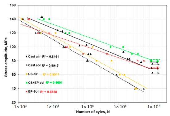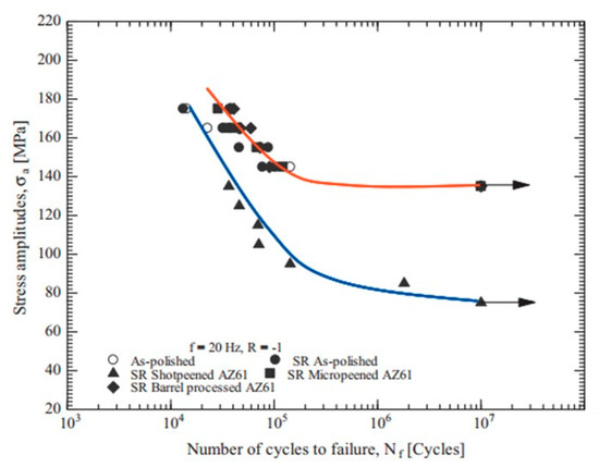 S–N curve of mechanical surface stress relieving treated AZ61 specimen “Reused with permission from Elsevier by License No. 5494631235674” [80].