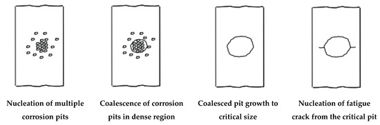 Schematic of the corrosion pit formation and crack growth of AZ80-T5 under 5% NaCl environment “Reused with permission from Elsevier by License No. 5494640105339” [26].