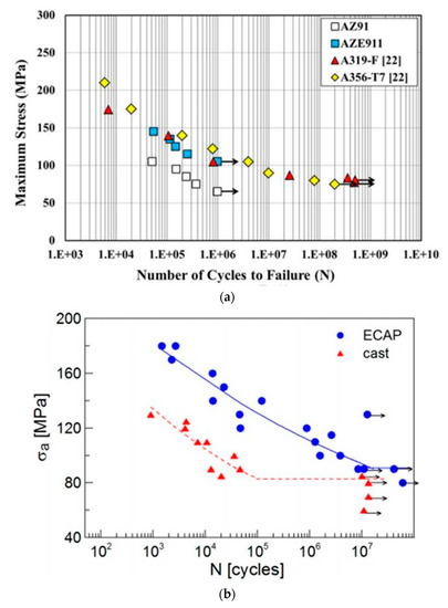 - Fintová, S.; Kunz, L. Fatigue properties of magnesium alloy AZ91 processed by severe plastic deformation. J. Mech. Behav. Biomed. Mater. 2015, 42, 219–228. [Google Scholar] [CrossRef]