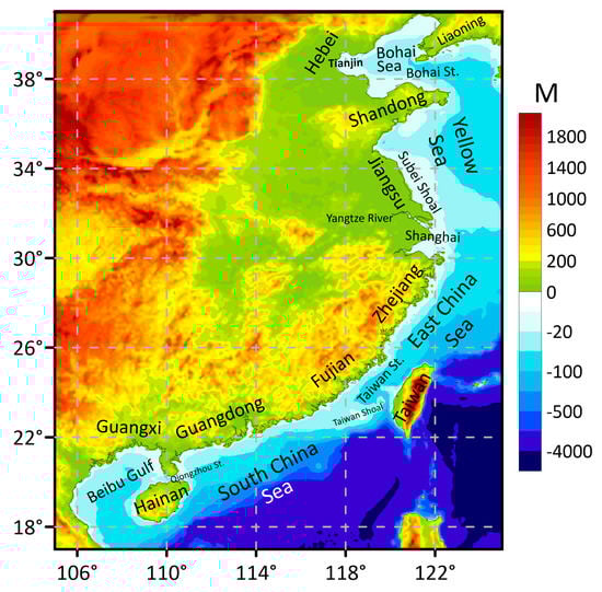 So far, few studies have investigated triple-energy joint harvesting in waters adjacent to China, and the complementarity of multiple energy resources within the diurnal band has not been fully revealed. Some studies have assessed the potential of OW and WA [27,28,29], OW and TS [30], and OW and solar [31] in the USA and Europe. The first assessment of their joint potential in China’s nearshore waters was performed in the South China Sea [32]. Although that study did not consider in detail the impact of the OW-WA hybrid on the total output, the results revealed three promising areas for hybrid power generation in the Taiwan Strait, Luzon Strait, and to the southeast of the Indochina Peninsula. Recently, the complementarity and synergy of OW and WA energy in the southern China coastal regions has been investigated [33]. It was revealed that the correlation between the two resources varies geographically, and the best sites for future joint exploitation are along the east China coast. It should be noted that the study did not include the northern waters adjacent to China, and the TS effect was neglected.