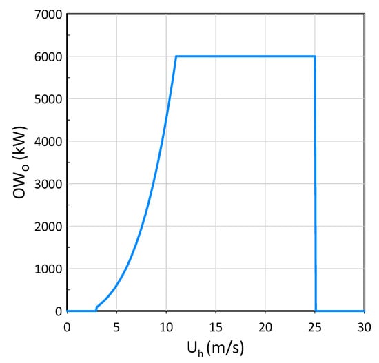 The OW power output from wind turbines () was determined by the cut-in/out of wind speed, the rated power, and the performance of a specific wind turbine. When the wind speed was less or greater than the cut-in or cut-out speed, the was zero or capped by the rated power. A wind turbine (SWT-6.0-154) developed by Siemens Gamesa (SGRE) was selected for this study. This kind of device has been widely installed in the China Sea, and the parameters are similar to those of other mature devices [33]. When the wind speed was between the cut-in and cut-out speeds, the was obtained from the power curve of the SWT-6.0-154 (Figure 2).