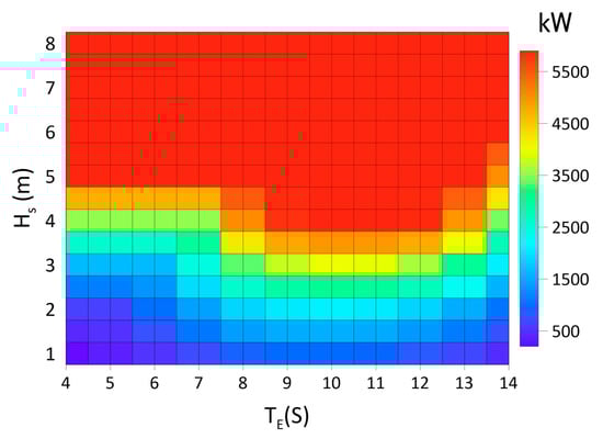 The WA power output () from a generator was determined by the performance of the device, the significant wave height (), and energy period (). We selected a floating, slack-moored wave energy converter named Wave Dragon to study the spatial–temporal variations of . This wave energy converter has a rated power (5900 kW) very close to that of the SWT-6.0-154, and it has been recommended for wave energy extraction in offshore areas [41]. The power matrix of the Wave Dragon is shown in Figure 3.