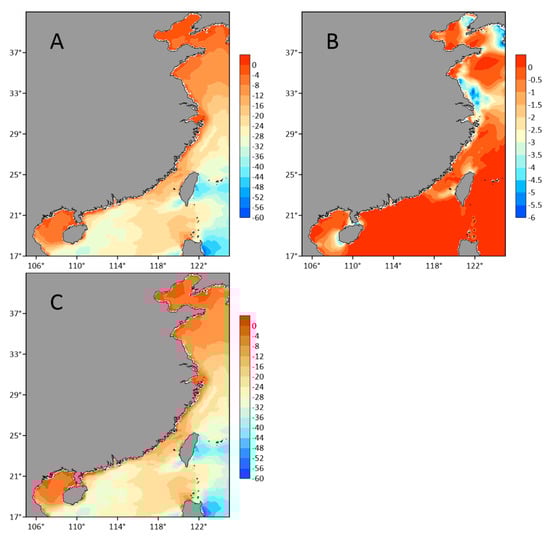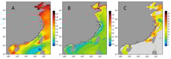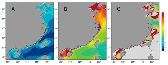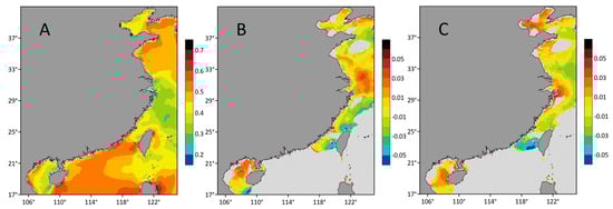 The time stabilities of the three energy components were obviously different (Figure 5). The spatial averaged of was the lowest, and the lower appeared in the deeper regions. The of was significantly higher than for in most waters. The was more temporally stable in the nearshore waters which are close to open water, such as along the Zhejiang and Guangdong coasts. The of was around 1 at the hotspots, which was comparable with that of , but less than for .