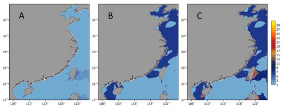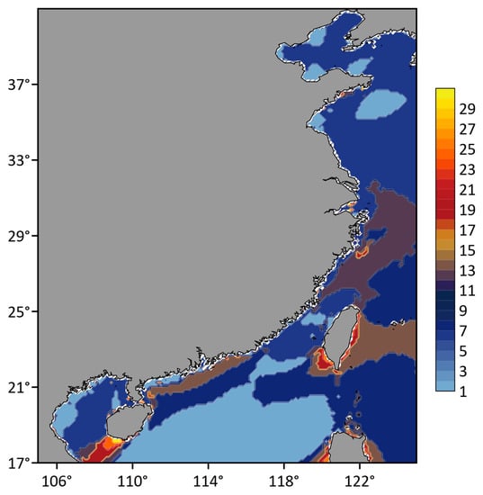 First, we separately calculated the time-averaged outputs from OW turbines, WA converters, and TS turbines. In order to make the values of the three outputs comparable, and were set at 4 and 10, respectively. The was the largest component in the nearshore waters (Figure 4). Its geographical variation was not as remarkable as the other energy sources. The maximum of occurred in the Taiwan Strait and the Luzon Strait due to topographic effects. The was larger in offshore areas than the nearshore areas. The of was less than 2 MW in most areas to the north of the Yangtze River, in the Taiwan Strait, and in the Beibu Gulf. In other areas, the high (>2 MW) regions were close to the coastline. Its value reached more than 4 MW, which was larger than the in those areas, to the east of Taiwan Island and in the central basin of the South China Sea. Contrary to the other two types of MRE, the of was less than 0.3 MW in most of the studied waters. The was zero in the center of the Yellow Sea, to the east of Taiwan Island, and in the continental shelf area of the northern South China Sea, since the maximum tidal current speed is less than 0.5 m/s in those places. There were several high- hotspots, which were the waters in the northern Bohai Sea/Strait, in the Subei Shoal, in the Taiwan Strait, and in the Qiongzhou Strait. The maximum of was about 1 MW at these hotspots.