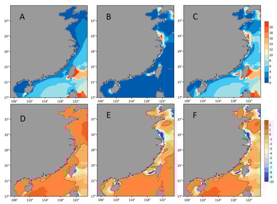 The differences between the scenarios (Figure 9) for the least and were twofold. Firstly, along the coast of Guangdong and Zhejiang, the target number of WA converters changed from 0.25 to 0.5. In this condition, the enhancements of increased by ~6% to ~10% (Figure 10a), while the relative changes of were still ~2% (Figure 10b). Especially near the Peal River Estuary, the increase was larger than 14%. Secondly, to the southwest of Taiwan Island and Hainan Island, the area of the regions with high increased and the enhancements of were further enlarged; on the other hand, the in those regions did not obviously change compared with the scenario for the minimum .