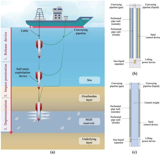- Gas–liquid lifting system comprises conveying pipelines (gas and liquid), a lifting power device, and a gas–liquid separator. With one end attached to the cavity and the other output through the pipelines, it can elevate the liquid and gas within the cavity to lower its internal pressure, which lowers the pressure of surrounding reservoirs, thereby driving the NGH decomposition. Then, natural gas and water enter the cavity through the sand control device due to the pressure difference and lift them to offshore platforms.