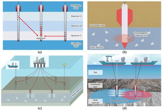 In addition to the insufficient gas production capacity, the current marine field tests suggest these problems: (i) Drilling construction, which requires the drilling platform to maintain its position under complex deep-sea conditions and drills through soft and collapse-prone reservoirs with a kilometer-long drilling pipe system in tow, is challenging in terms of current technologies [,]. (ii) Long-term exploitation, which relates to the permeability of the NGH reservoir, the sand control devices in the wellbore, and the strength and stiffness of the casing as well, has been improved in the project using hydraulic fracturing, novel sand control devices, and horizontal wells. However, no revolutionary increase in production capacity has been seen, and the maximum extraction cycle lasts only 60 d [,,,]. (iii) High construction cost, caused by the prohibitive cost of deep-sea drilling platforms, and combined with the serious issues mentioned above, the cost of extraction far exceeds the value of the gas recovered [,,].