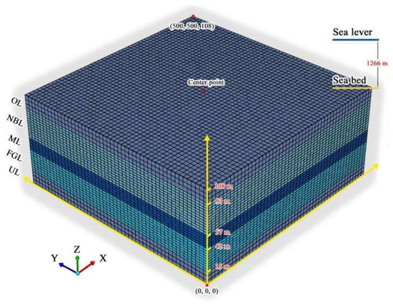 The model (Figure 5) is divided into the overburden layer (OL), NBL, MX, FGL, and underlying layer (UL) from top to bottom, corresponding to thicknesses of 15 m, 36 m, 15 m, 27 m, and 15 m, respectively. The size of the model is 500 m × 500 m × 108 m, and the specific reservoir parameters are provided in Table 1. It is worth mentioning that the feasibility of the simulation method in this area has been verified in previous studies, and better fitting results have been obtained []. Thus, no relevant validation is performed in this study.