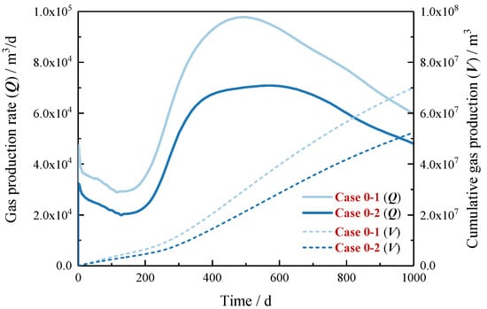 Moreover, it can be clearly seen that production pressure has a significant influence on the effect of gas production. The lower the production pressure, the greater the drive for NGH decomposition. In addition, after 500 d, the rate of Q decline in Case 0–1 is greater than that in Case 0–2. This is because the heat transferred from the surrounding environment is less than the heat absorbed by the NGH decomposition, and the excessive decrease in reservoir temperature may lead to secondary NGH formation and ice generation, blocking the seepage channels of the reservoir. Thus, it is necessary to take some supplementary heat measures under low pressure conditions.