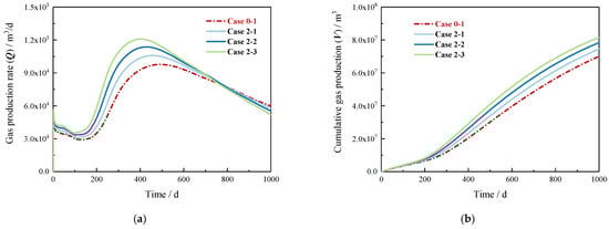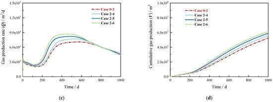 Gas production characteristics for the open-hole position adjustment: (a) gas production rate (1 MPa); (b) cumulative gas production (1 MPa); (c) gas production rate (4 MPa); and (d) cumulative gas production (4 MPa).