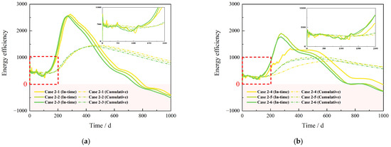 Moreover, when carrying out thermal stimulation methods that need outside energy, energy efficiency can reflect the relationship between the heat input and the resulting additional gas production. In this study, in order to better evaluate the effect of heating, we defined in-time energy efficiency and cumulative energy efficiency. The former is the ratio of the additional gas calorific value generated by heating to the input energy per unit of time, and the latter is the overall ratio in a certain period. Figure 9 shows the energy efficiency of the internal wall heating under low and high pressure production conditions, respectively. In the case of P = 1 MPa, the energy efficiencies of the three cases are basically the same, with some fluctuations in the first 150 days due to the secondary production of NGH and ice formation. The inflection point is around 300 days, before which the higher the heating power, the higher the in-time energy efficiency, but after that, the trend reverses. In the later stages of exploitation, the heating value of the produced gas is already lower than the energy input value. Therefore, a reasonable heating strategy can be considered in actual production such as high power in the early period, low power in the middle period, and stopping heating in the last period. In the case of P = 4 MPa, the early trend of the curve is similar to that of low pressure, but after 150 days, the in-time energy efficiency of Case2-4 is significantly lower than that of the other two, which shows that under the high production pressure, the effect of pressure-driven NGH decomposition is weak. If the heating power is too low, the effect of enhancing production is limited. In the middle and late stages of production, the general trend is again similar to low pressure, but there is no sizeable negative value in the later stage. Therefore, in actual production, the heating strategy of high power in the early period and low power in the middle and late periods can be considered.
