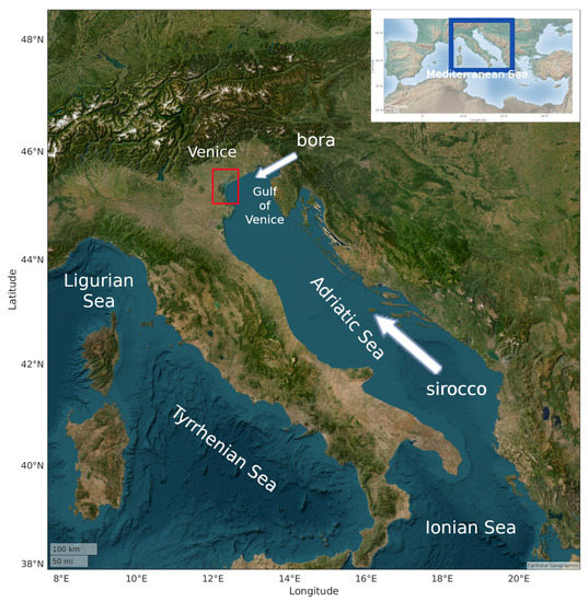 Storm surges are intense increases in sea level, caused by severe stormy conditions. They are frequent in autumn and winter, in the Adriatic Sea, a semi-enclosed basin of elongated shape in the SE-NW direction, and surrounded by mountain chains. On the other hand, high tides in the northern end of the Adriatic Sea have higher elevations than in the rest of the Mediterranean Sea. These characteristics favour the occurrence of high tides in the northern end, triggered by south-eastern winds such as sirocco, which blows along the Adriatic Sea longitudinal axis. A sketch of the main winds along the Adriatic Sea, and the position of the Venice Lagoon, is reported in Figure 1.