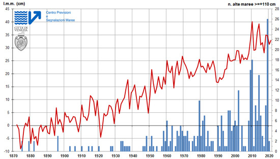 The meteorological condition responsible for the occurrence of the sirocco wind that produces storm surges in the Gulf of Venice is described in [1], among others. It is a deep low-pressure system that moves from west to east of the Adriatic basin, channeling the airflow along the Adriatic and making it interact with the high orography of the surrounding coastal regions, the Apennines to the west and the Dinaric Alps to the east. After the low-pressure system leaves the basin, bora often sets in, sometimes determining water level differences, between the southern and the northern sides of the Venice Lagoon, that may exceed 50 cm [2,3,4]. The complex interaction of the wind flow with the topography of the basin thus requires accurate wind field forecasts, which, on the other hand, often misrepresent the wind pattern observed by in-situ measurements and remotely sensed observations of satellite scatterometers. In the last 150 years, an evident positive trend has been registered in Venice for both the yearly number of high water events and the mean sea level height, as shown in Figure 2 (Courtesy of Centro Previsioni e Segnalazioni Maree, Comune di Venezia(Tide Forecast and Early Warning Centre of the Venice Municipality—CPSM) http://www.comune.venezia.it/it/content/variazioni-livello-medio-mare, accessed on 23 December 2022). The trend is likely to persist in the next decades [5]. The mobile barrier system MO.SE. (http://www.mosevenezia.eu/, accessed on 15 February 2023) has been realized, and has started to protect Venice and its lagoon from flooding since late 2020. Nonetheless, it is still necessary to predict and monitor the storm surges approaching the Gulf of Venice: the closing and opening of the mobile barriers have to be accurately managed to minimize the negative impact on the economic, health and emergency sectors and on the transport of people and goods.