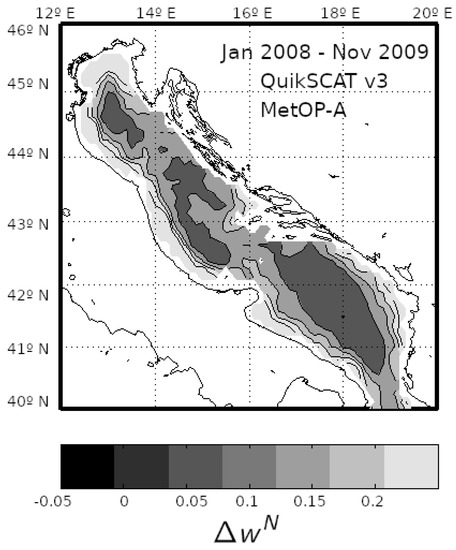The average number of scatterometer passes over the Adriatic Sea is around 3–4 times a day, with maxima during limited periods of simultaneous operations of QuikSCAT/MetOP-A and Oceansat-2/MetOP-A and -B (4–6 passes a day). With such a low number of collocated scatterometer-model data at each grid point, it is necessary to collect and average scatterometer observations during a period of some days in order to obtain statistically reliable quantities. However, arbitrarily enlarging the averaging window would turn to a loss in correlation between observations pertaining to different meteorological patterns, thus reducing their statistical significance. For the present application, the optimal size of the averaging period resulted in three days [8].