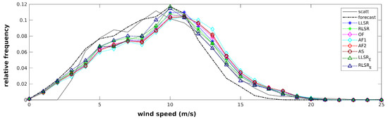 Table 2 (fourth row for the D3 dataset) reports the biases between the scatterometer set of observations and the corresponding set of the standard forecast in the third column, and from the fourth to the eleventh columns, reports the bias between the scatterometer and the eight mitigated forecast solutions. For all the datasets, the bias of the standard forecast with respect to scatterometer observations ranges from 0.84 ms, while for the mitigated forecasts, its maximum value is 0.46 ms (minimum −0.50 ms). In general, the mitigated forecasts have lower bias, in modulus, than the standard forecast.