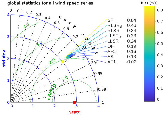 Taylor’s diagram showing the statistical indicators (cRMSD, linear correlation, standard deviation and bias) for the D3 dataset. Statistical indicators are calculated by considering all the pairs of observation-model as independent.