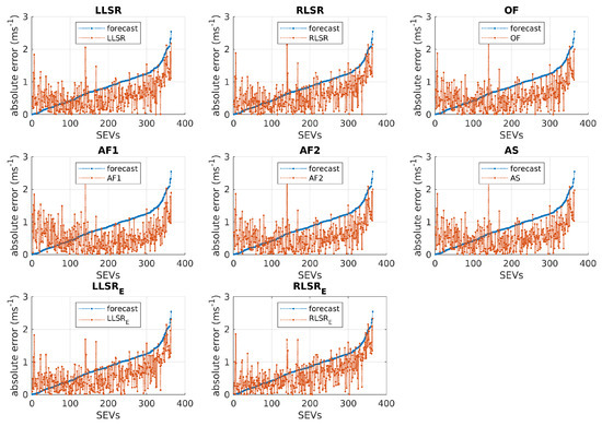Here, the absolute error of the mean mitigated forecast and the scatterometer winds for each SEV of dataset D3, are plotted in orange and ordered by increasing the absolute error of the mean standard forecast and the scatterometer winds. The latter are reported in blue (they are the same in all eight plots). In practice, SR is the number of orange markers above the blue markers divided by the total number of SEVs, multiplied by one hundred. Very small differences are seen from plot to plot, and the SR of the LLSR MF is the same as the OF, AF2 and AS. However, the LLSR approach performs best in all four datasets, indicating the superior overall performance of this MF over the others. Another feature of the LLSE and RLSR MFs is that both show lower absolute errors with respect to the other MFs where the standard forecast absolute error is low (first 100 or so). On the other hand, AF1 performs better for the SEVs from 200 up to 364.