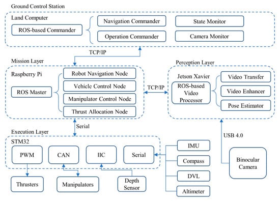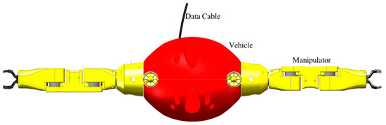 - A novel concept of a dual-arm UVMS with manipulators as its core is proposed, the mechanical structure is designed in detail based on the modular design approach, and the control architecture is constructed based on the Robot Operating System (ROS).