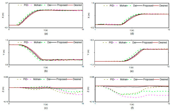 - In the presence of uncompensated disturbances, i.e., , the system error will converge to the regionin finite time, where and are the minimum eigenvalues of and . In addition, the position errors and velocity errors converge to the regions
