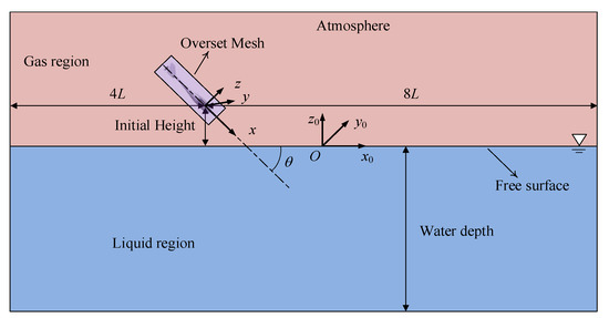 To describe the hydrodynamic forces and motions of the vehicle, there are two right-handed Cartesian coordinate systems as shown in the sketch in Figure 4. In this study, the vehicle changes its wing span and orientation before water entry, and the simulated object is the UAUV under the folded state (AUV mode). In order to display the direction of the y axis more clearly, the wings are unfolded as in Figure 4. O-x0y0z0 is the inertial Earth-fixed coordinate system, and fixed in the space is defined with O arranging at the center of gravity (CG) of the vehicle; the x0 axis coincides with the mean water surface, and the z0 axis points upward. In addition, a moving coordinate system of O-xyz fixed on the vehicle is defined, with its horizontal axis Ox and vertical axis Oz aligned at the right angle and along the moving direction of the vehicle, respectively.
