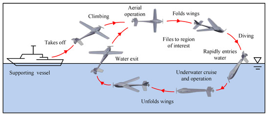 As shown in Figure 2, the main stages of the complete operation are taking off, climbing, aerial flight, diving, water entry, underwater cruise, floating, and water exit. In an ocean survey, when the supporting vessel arrives at the ingress area, the vehicle is launched from the deck. Thereafter, the vehicle flies to the wrecked area and surveys aerially above the water surface. Then, the vehicle immerges into the water to investigate the region of interest. When the underwater cruise is completed, the vehicle floats up by the propellers. The stream flow produced by the propellers and the lift forces generated by the wings can also help the UAUV convert into flight state smoothly. Upon water exit, the UAUV communicates with the supporting vessel and transmits key data for making timely decisions afterward. Then, the UAUV could continue aerial or underwater observation missions. This vehicle has a real-time ability to exchange information and achieve extensive range of both aerial and underwater investigations such as relay communication, marine environment reconnaissance, seabed detection, and rescue applications.