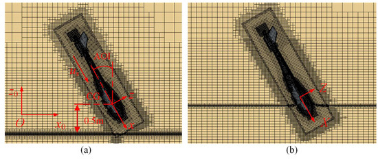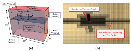 To solve the integral Equations (1) and (2) numerically, the boundaries are represented in spatial and temporal discretized form. A mesh strategy with high computational accuracy and fast efficiency should be selected for simulation calculation. The sketch of the computational domain is shown in Figure 5a. The surface remesher is used to generate the volume mesh for a trimmed nonstructured mesh, which has better geometric adaptability. There is an overset mesh block around the free surface, moving in the vertical plane, as shown in Figure 5b. Data exchange between two blocks is realized by the least square interpolation. The DFBI solver should been created, and it is necessary to specify the manner in which the vehicle body can move freely. In this study, the vehicle body is set free to translate in the x axis (lateral direction) and in the z axis (transverse direction) and to rotate about the y axis (pitch). Overset AMR and free surface AMR are utilized during the simulation process.